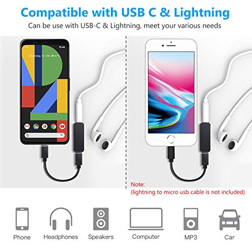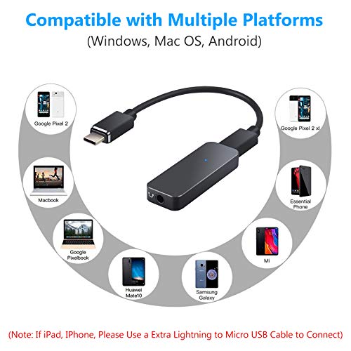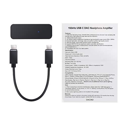 Amplia compatibilidad: El Amplificador DAC Portátil Es Compatible con la Mayoría de los Dispositivos Android 5.1 o Superiores con Protocolo Estándar USB-C, como Google Pixel 2 / 2XL / 3 / 3XL, MOTO Z / Z2, Oneplus 7 Pro, Huawei Mate10 Pro / P20 / Mate20 y Samsung Galaxy S8 / S9 Note 10 Pro. También Funciona con iPhone X / XS / XS MAX / XR, iPhone 8/8 Plus, iPhone 7/7 Plus, 6 / 6Plus. (Agregue un Micro usb Adicional al Cable de Iluminación para Conectarlos)